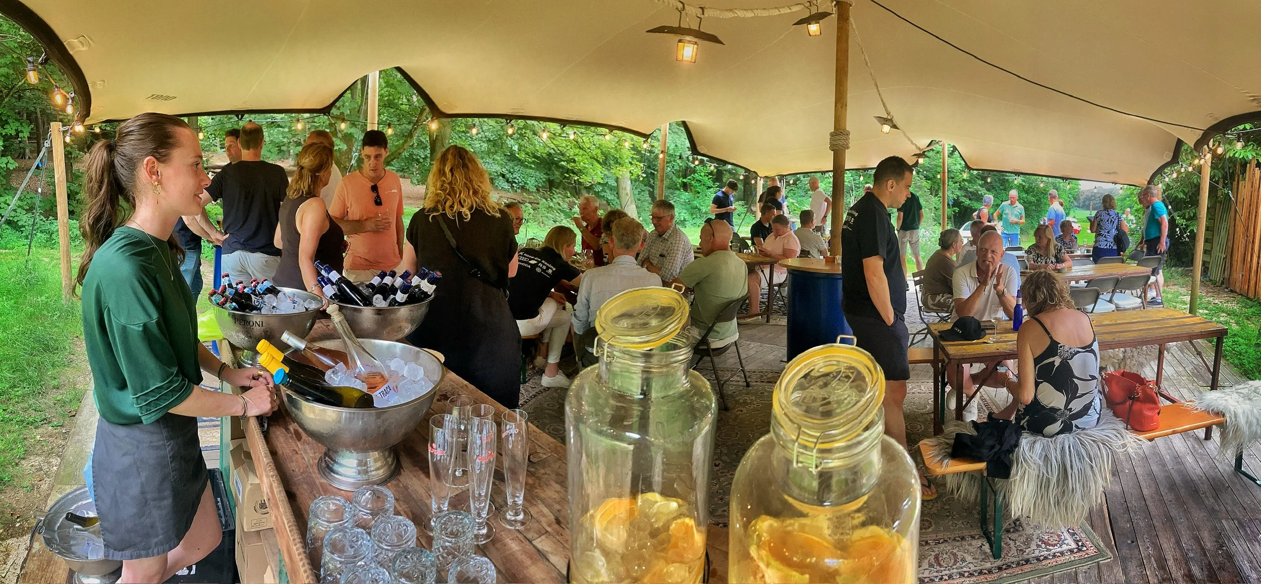 De overkapping zorgt ervoor dat je droog en comfortabel zit, ook als het weer even niet meewerkt. Er is zitruimte met tafels en stoelen voor maximaal 50 personen. Kom je met een groter gezelschap? Geen probleem – we creëren graag extra staplaatsen, zodat je met zo'n 65 gasten kunt genieten van deze unieke setting. De Bostent is beschikbaar van april tot en met oktober.